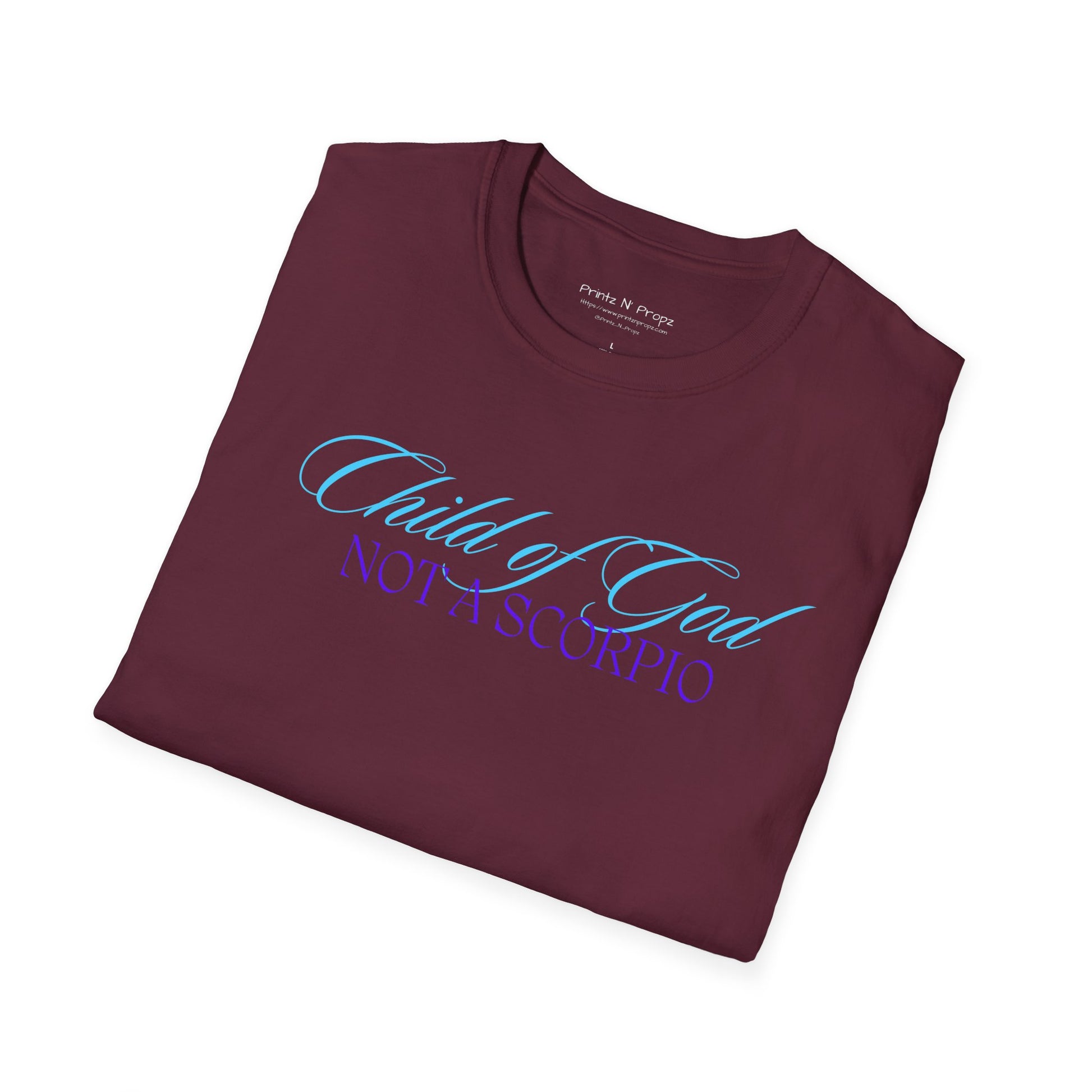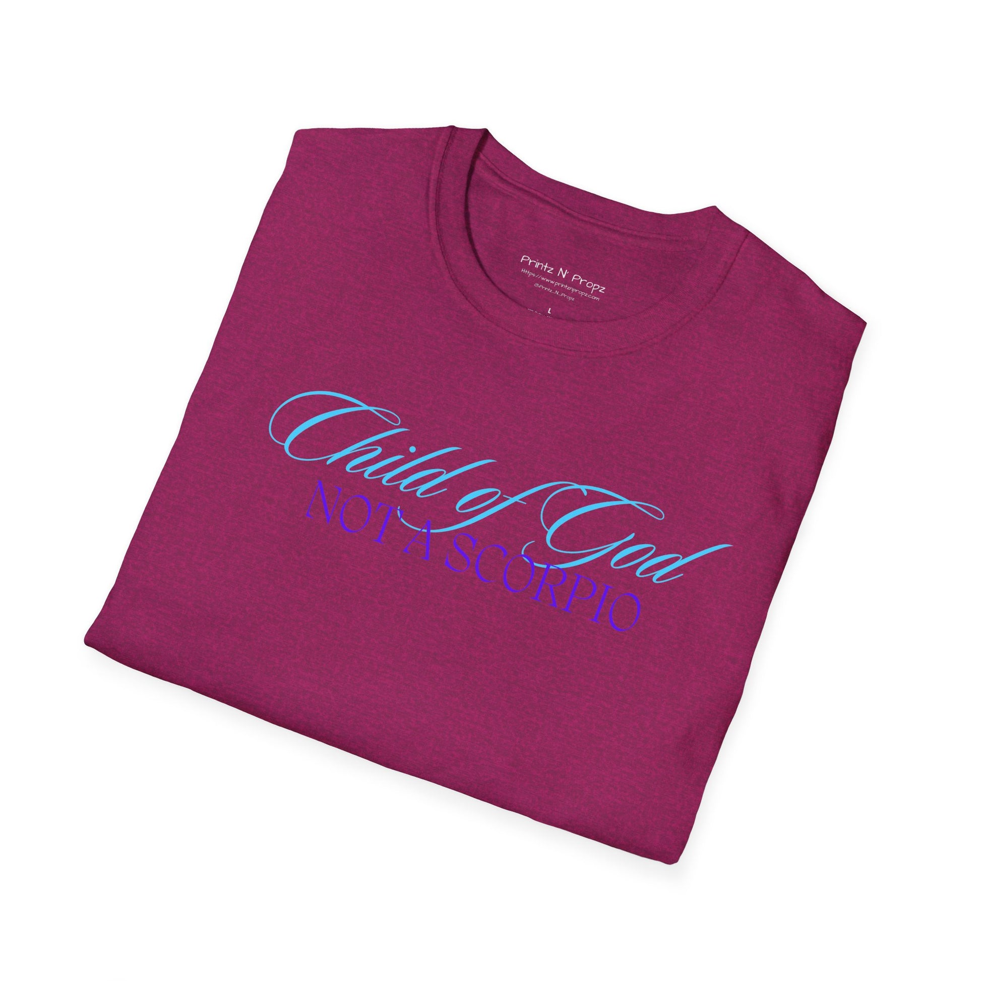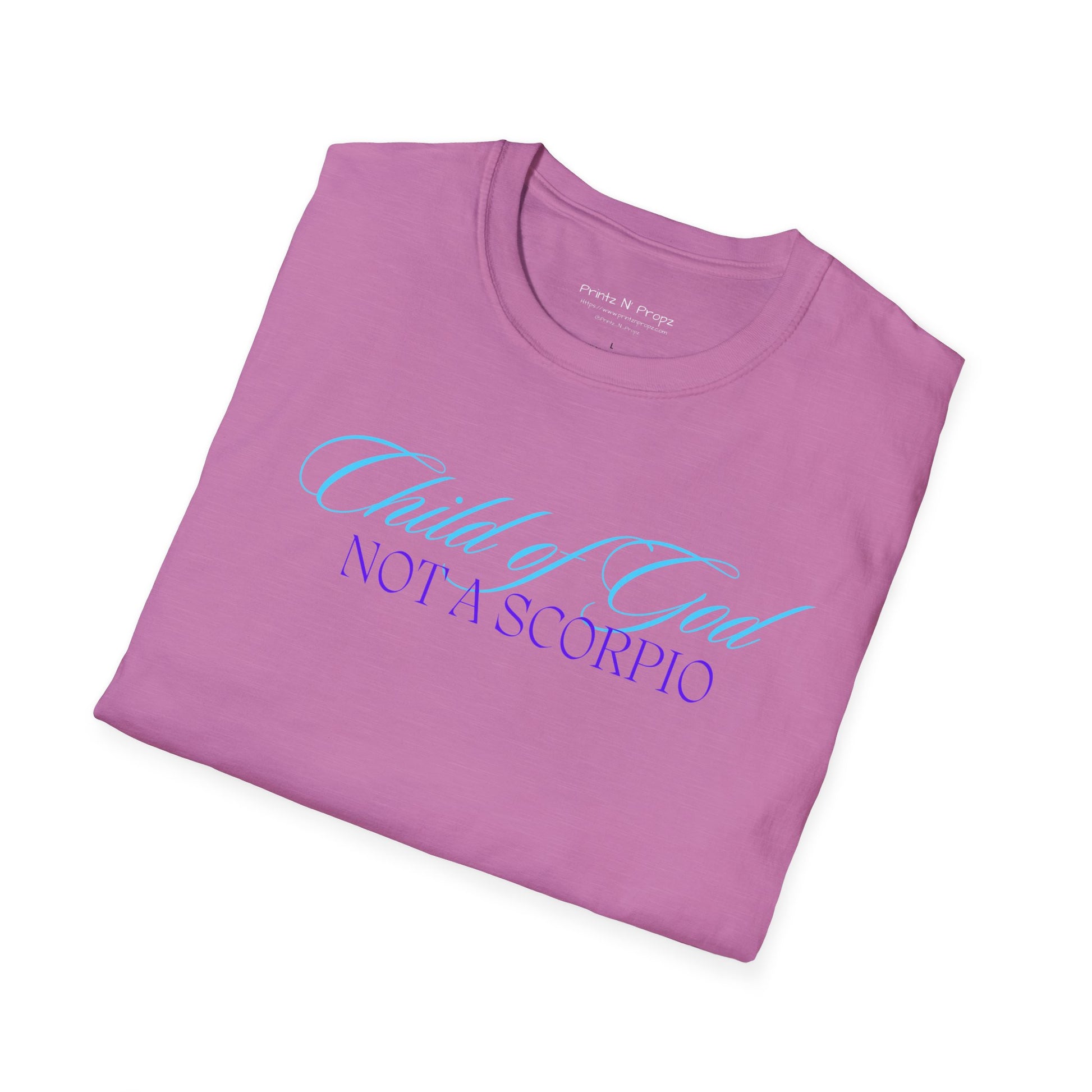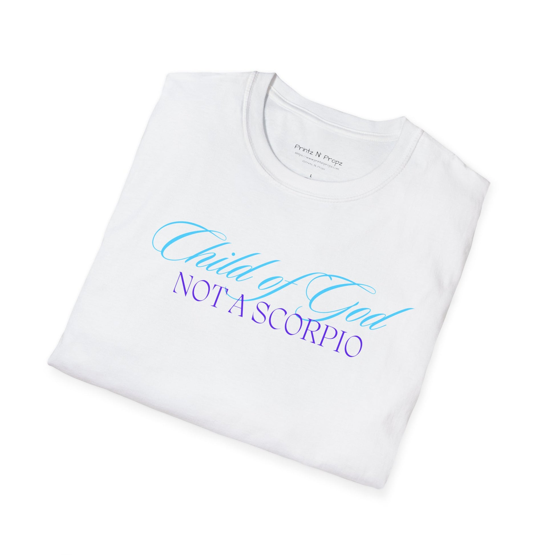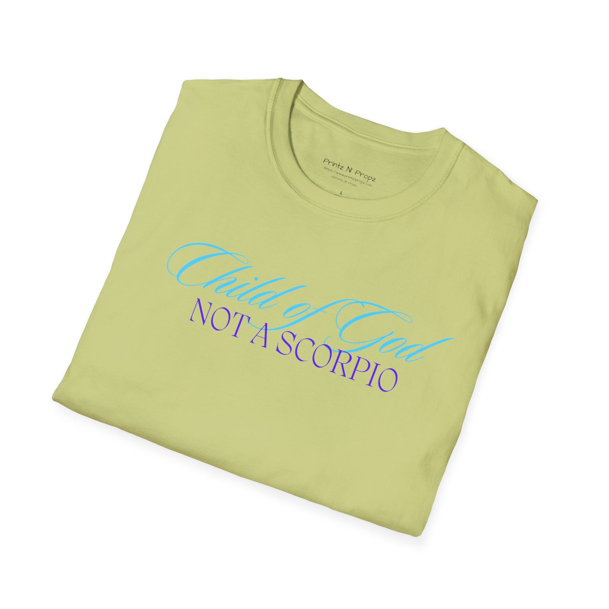 A unisex softstyle T-Shirt with a design that reads 'Child of God not a Scorpio'. This T-Shirt exudes a spiritual and unique vibe, perfect for those who appreciate individuality and self-expression. Ideal for those who are into astrology and spirituality, this T-shirt can be a great conversation starter. Perfect for casual wear or as a thoughtful gift for birthdays or spiritual celebrations.